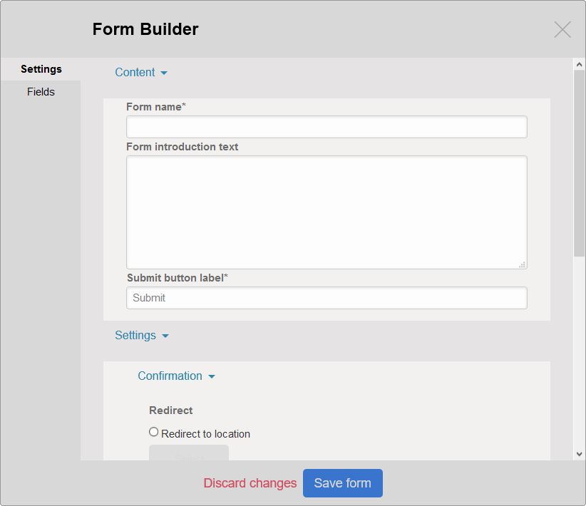 - Create forms in your landing page with the Form Builder. A special Form Block allows you to add forms with different types of fields to the landing page. This system has been designed to be extended, so that you can create your own form fields. The system also provide an interface to access the data that has been collected, and download it as CSV files.